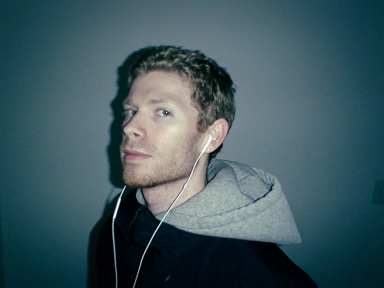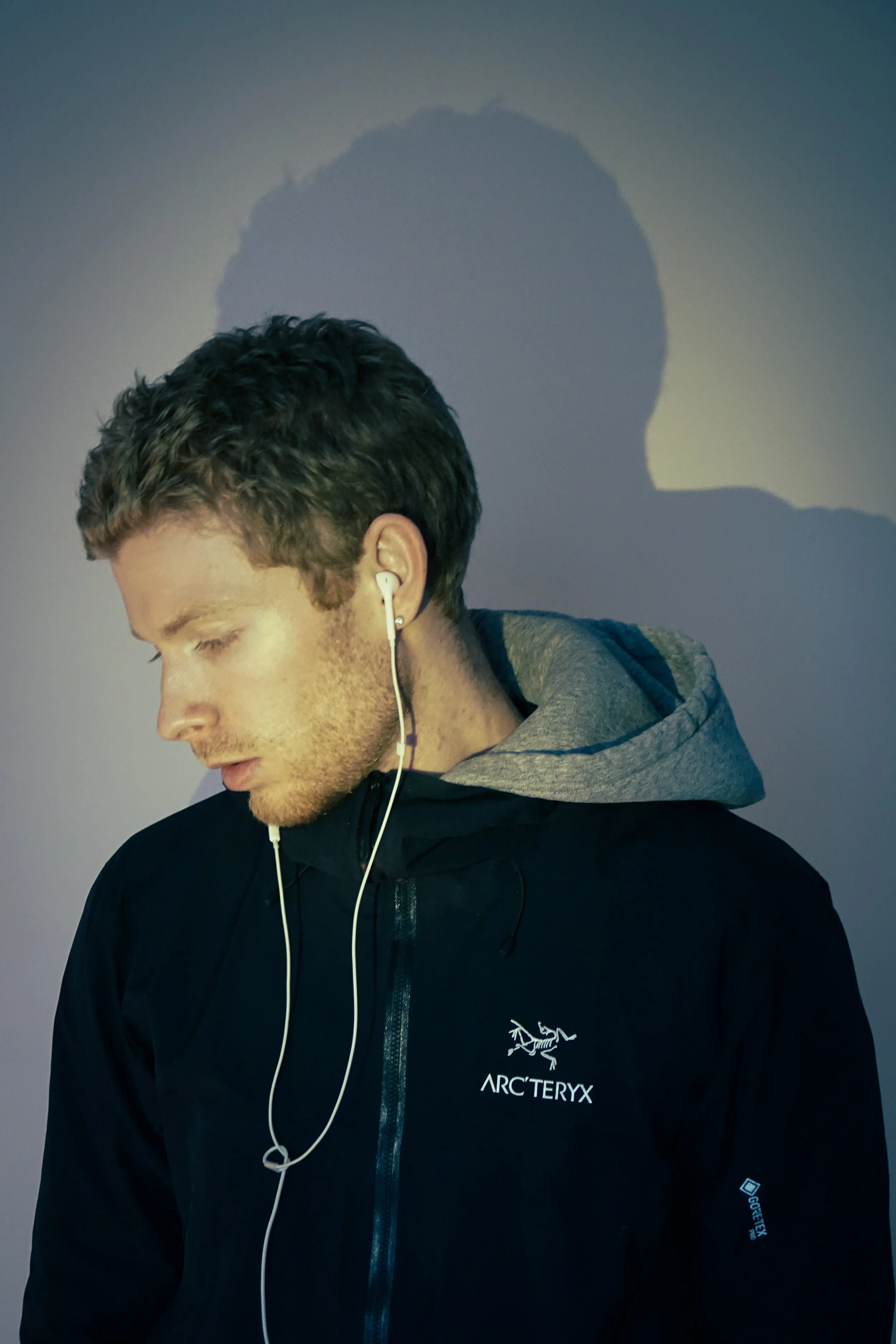 Young man with curly hair, wearing a gray hoodie underneath a black Arc'teryx jacket, and white earphones, looking down with a shadow cast on the wall behind him.