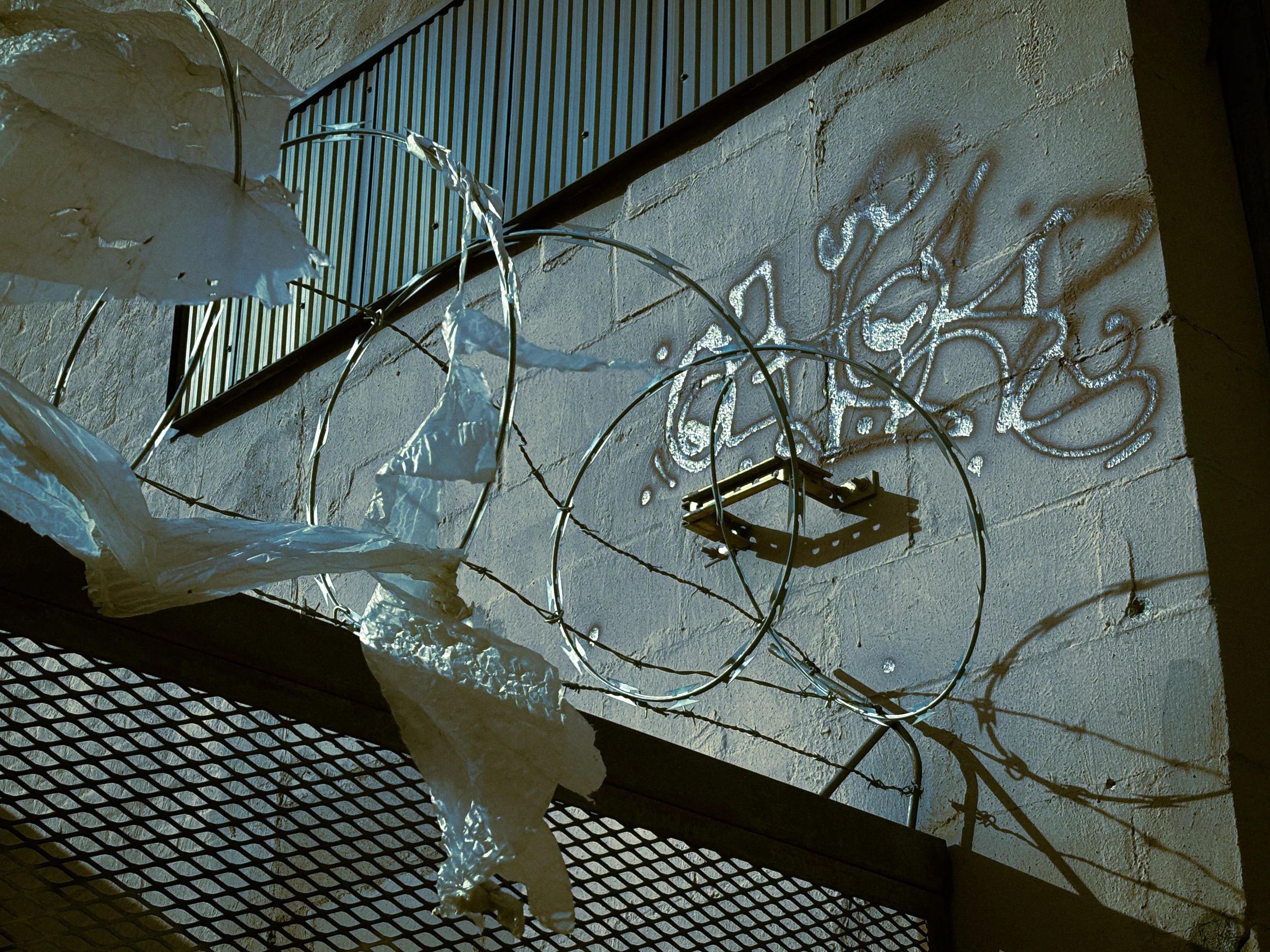 Detail of a wall with barbed wire, reflective metal circles, and illuminated graffiti-like scribbles.