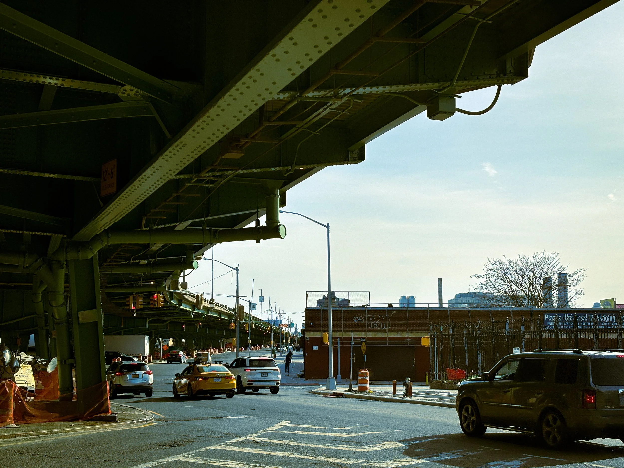 View of an urban street scene with cars on the road, an elevated highway overhead, a brick building with graffiti, and industrial buildings in the background on a clear day.