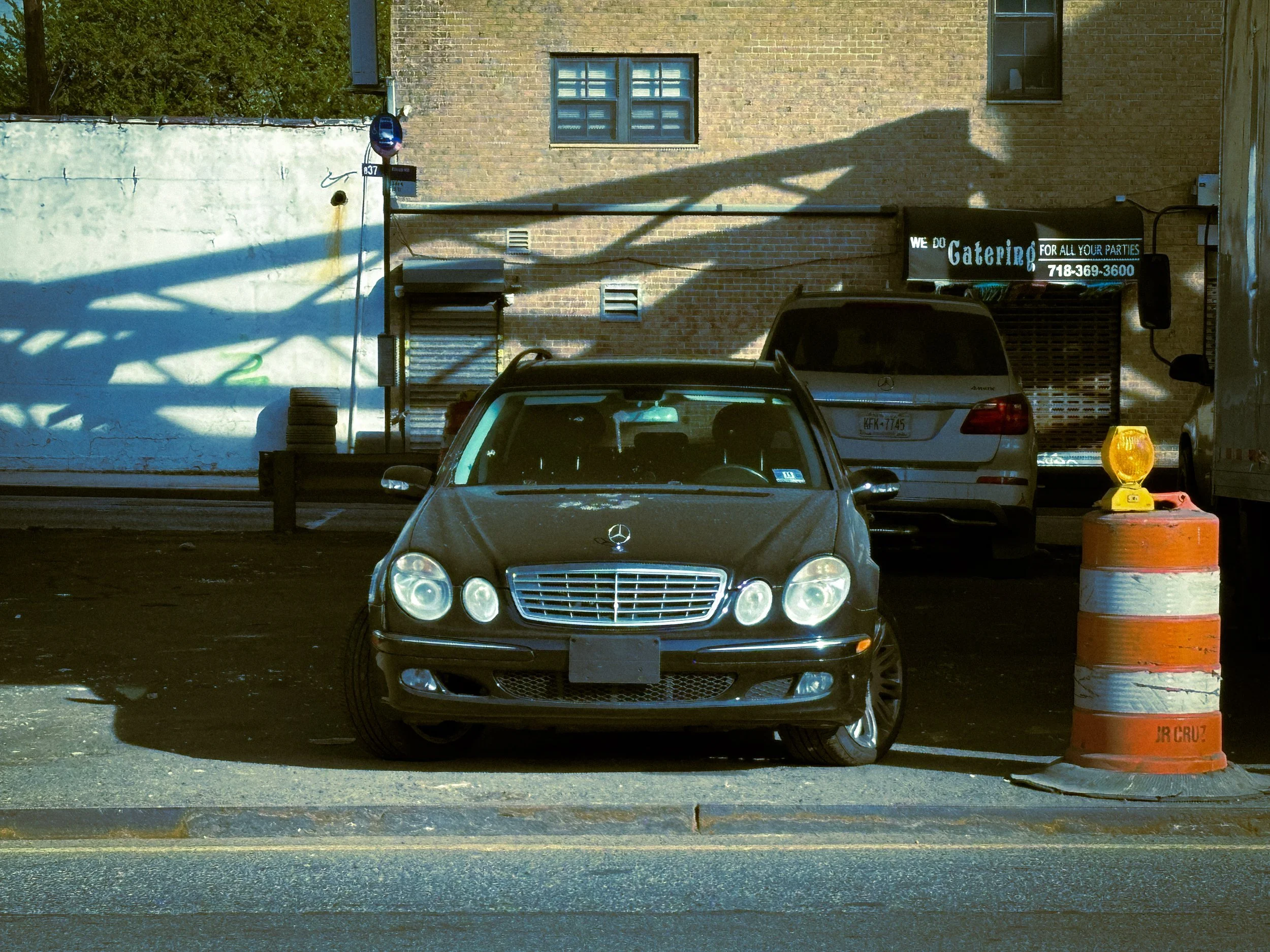 A black Mercedes-Benz car parked on the street in front of a brick building, with a large orange and white traffic barrel nearby and shadows cast on the scene. There are other parked vehicles and a business sign in the background.
