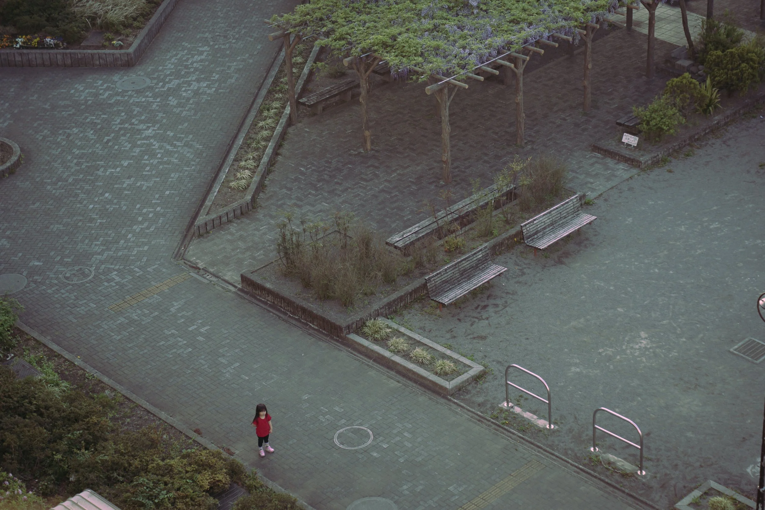 A young girl in a red jacket and pink shoes standing on a paved pathway in a park on a rainy day, with empty benches and trees around.