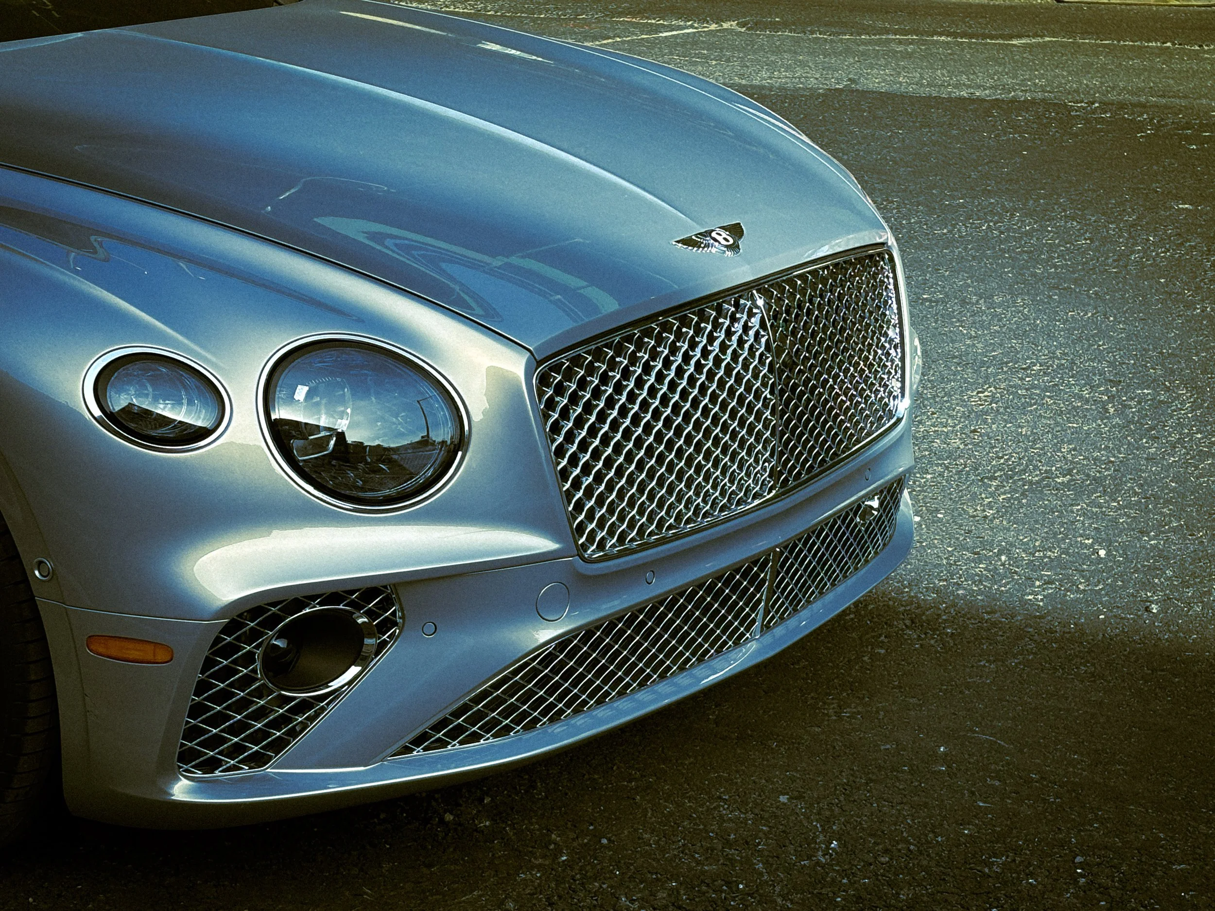 Close-up of the front of a silver Bentley car, showing the grille, headlamps, and part of the hood.