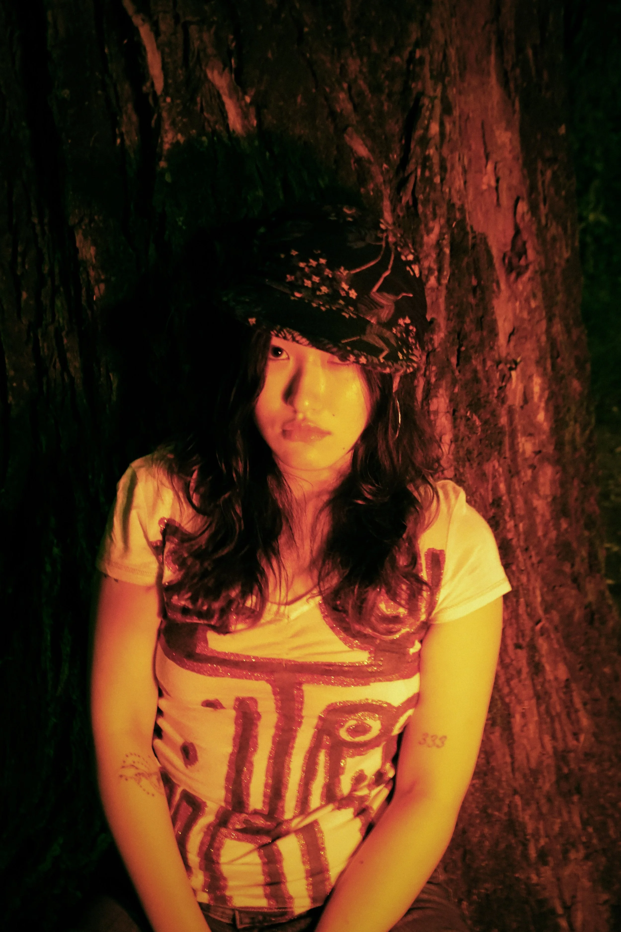 A woman with dark curly hair wearing a patterned cap, a graphic t-shirt, and hoop earrings, standing against a tree trunk at night under colored lighting.