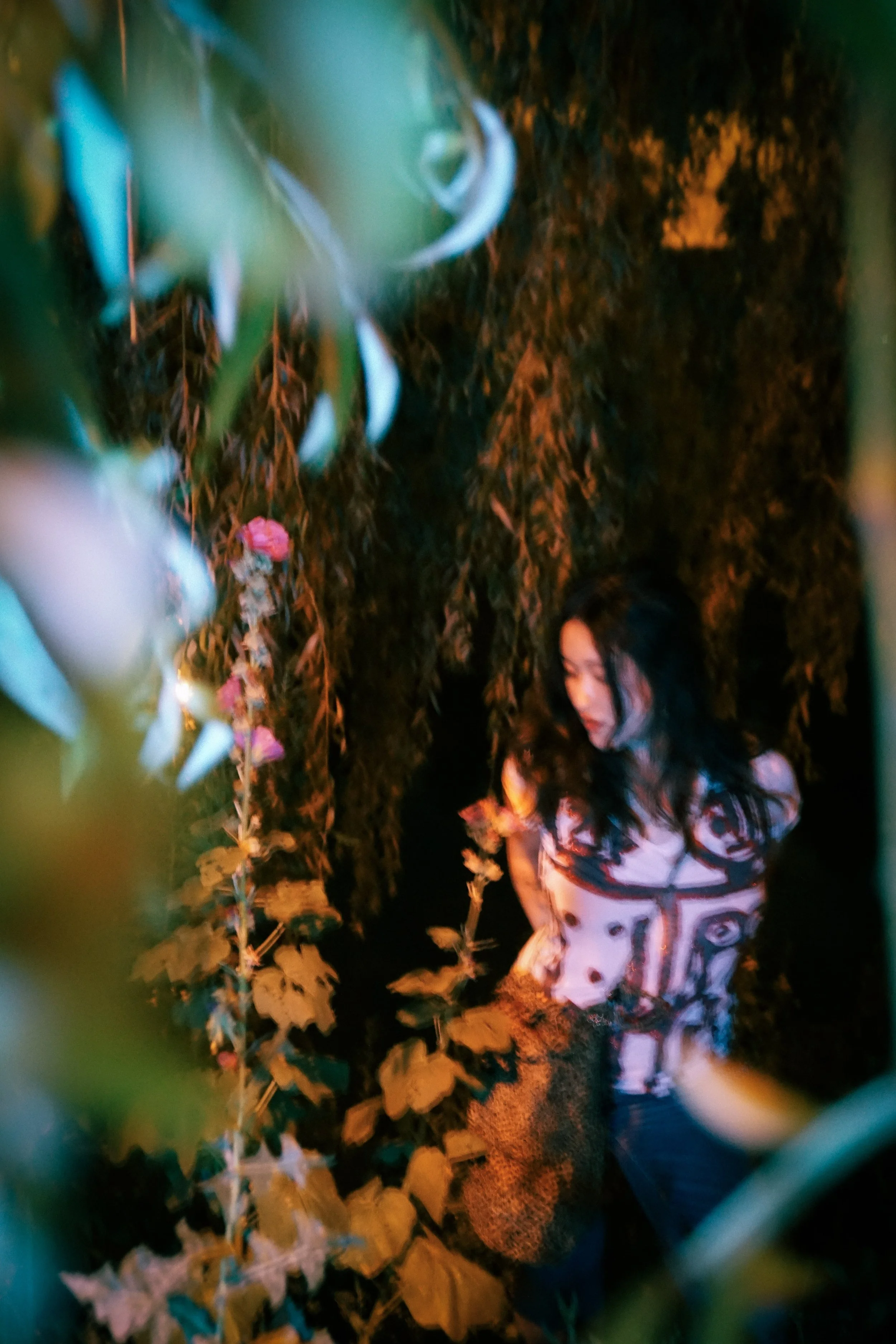 A young woman with dark wavy hair, wearing a patterned cap and a white T-shirt with red designs, is partially obscured by leaves, in a dimly lit outdoor setting with warm lighting.